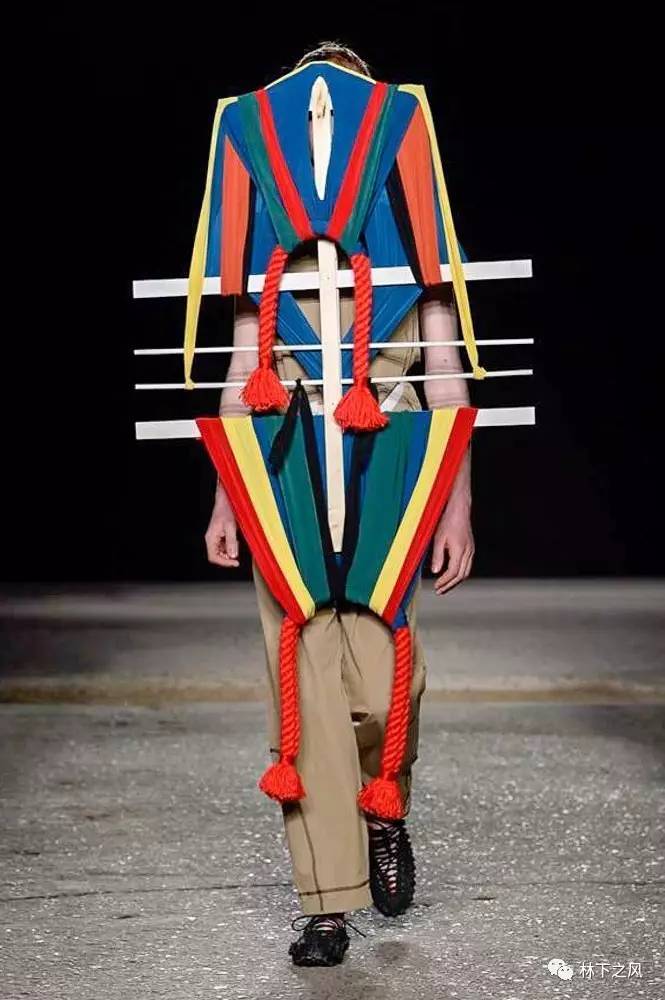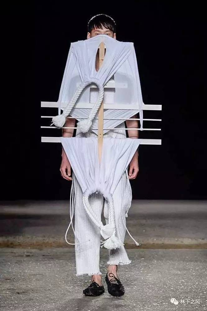 不过,如果要前卫到“上架展示”,那体现的可不仅仅是时尚理念,而是行为艺术的范畴。从这一点来说,颇受瞩目的男装设计师Craig Green(克雷格·格林)做了一次绝妙展现。真是的,又是圣马丁的研修生,这间学校对有个性的天赋者似乎特别爱惜纵容。