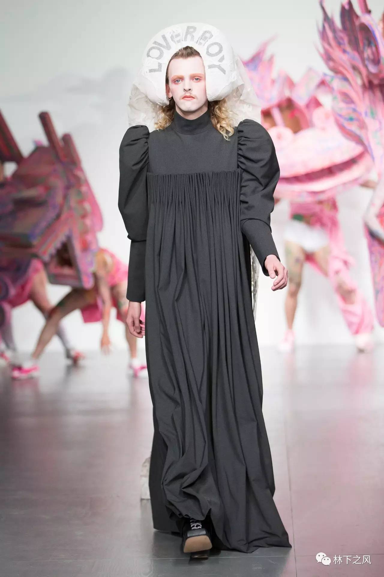 作为男装节的主题,前卫和先锋话题总是必不可少,这就好比本次男装节好些服装秀把,甚至布偶熊请上了T台。不过,他们都比不上Charles Jeffrey (查尔斯·杰弗里),作为圣马丁的毕业生,他干脆把最擅长的非性别着装和庆典结合在一起,做出奇妙的效果。