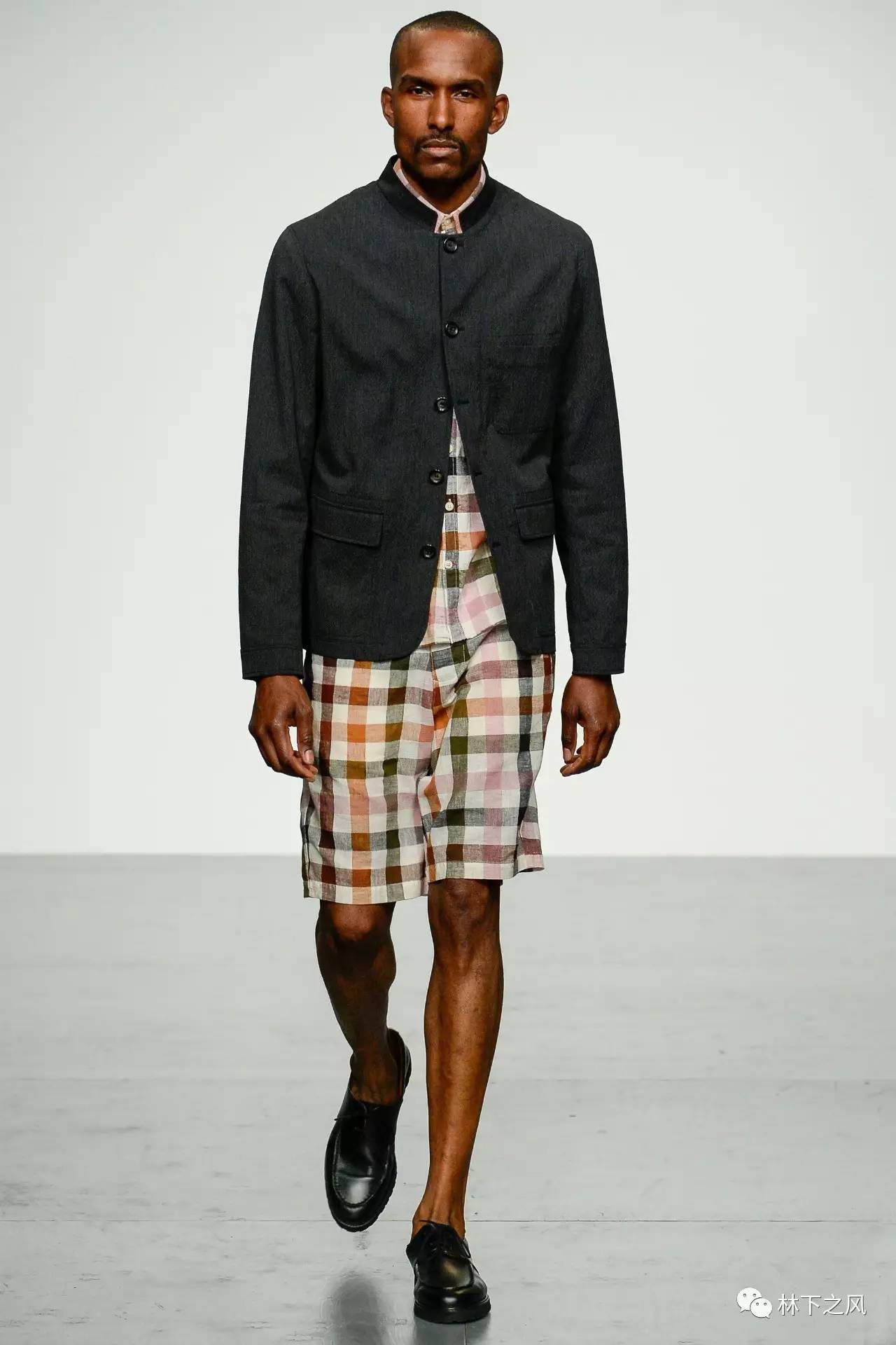 这是一款改良布雷泽外套搭配花式格短裤,传统的布雷泽外套通常用的是西装驳领,而改良款则改为小立领,并打开衣领间距,使得穿用更为方便。