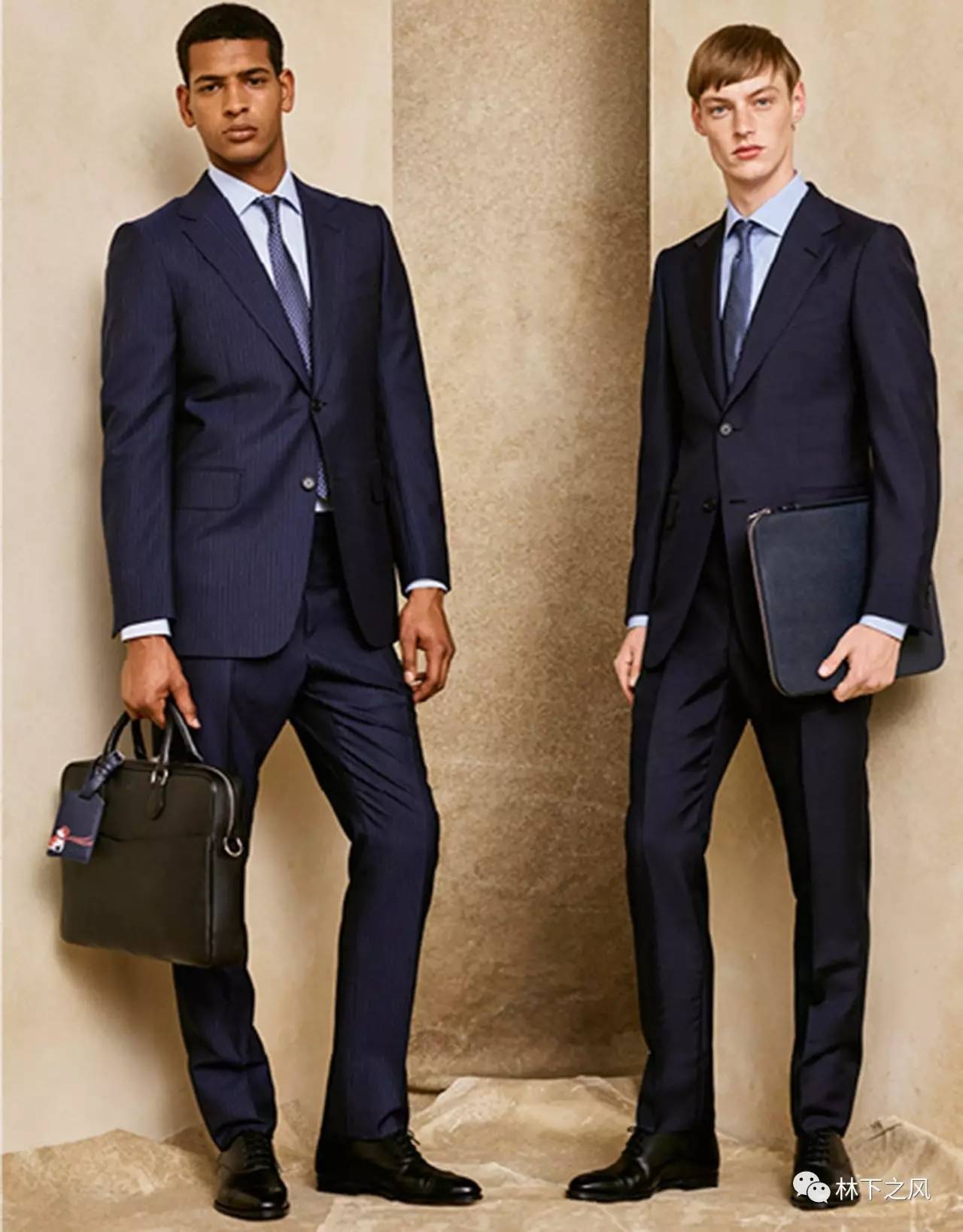 看过条纹西服和短风衣款式之后,藏蓝色西装也是男装不变的选择。区别只在细节和款式的微调,2018春夏登喜路的男装新款采用的是经典单排扣西装样式。