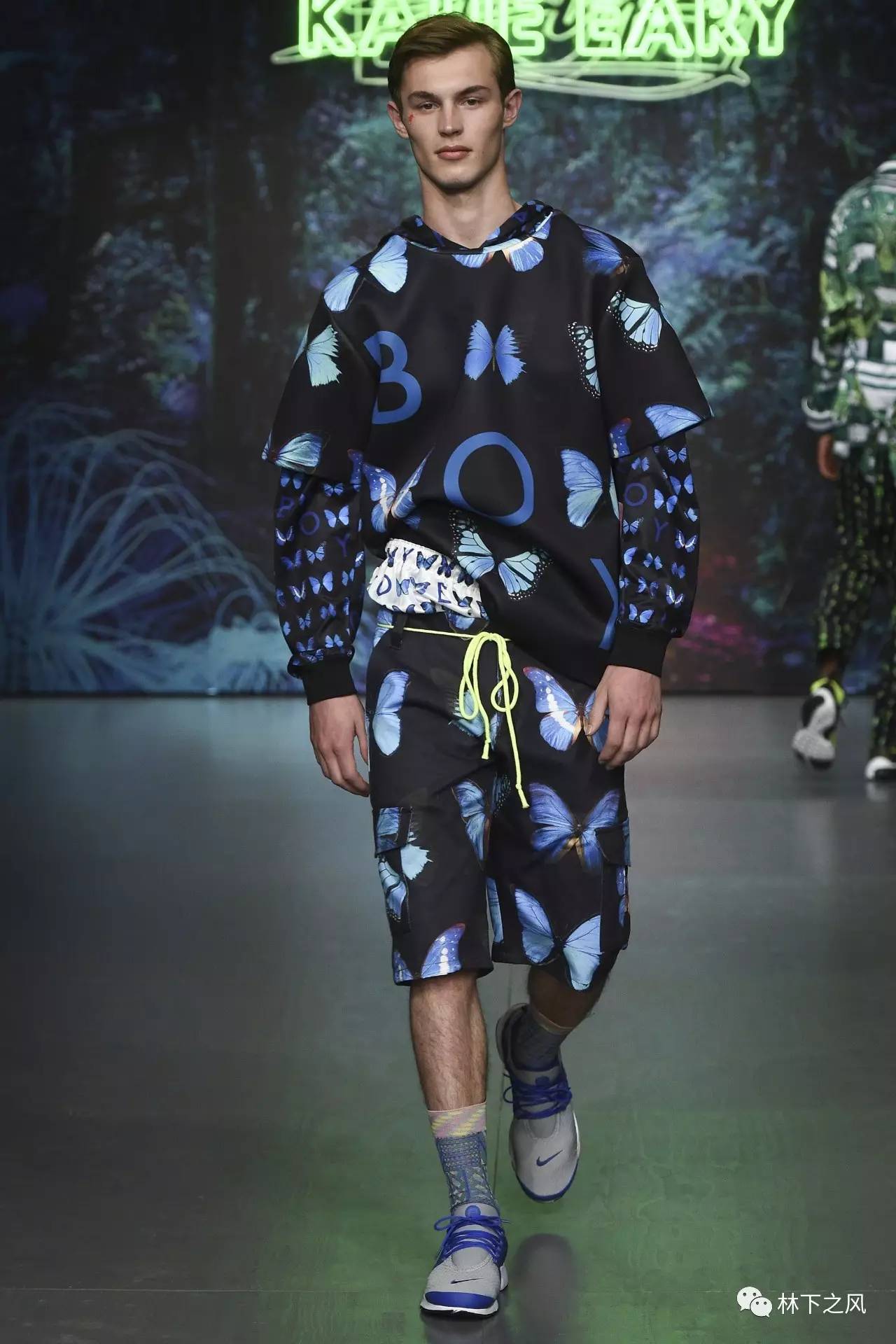 当然,合并秀的风格并不止行为艺术这一种,还有别种办法展示。比方说,本次男装节主推奇幻丛林风的Katie Eary(凯蒂·依厄)就是一例。作为设计男装的年轻女设计师,能在短短几年内崛起,被评为有创意有特色的设计师,实属不易。